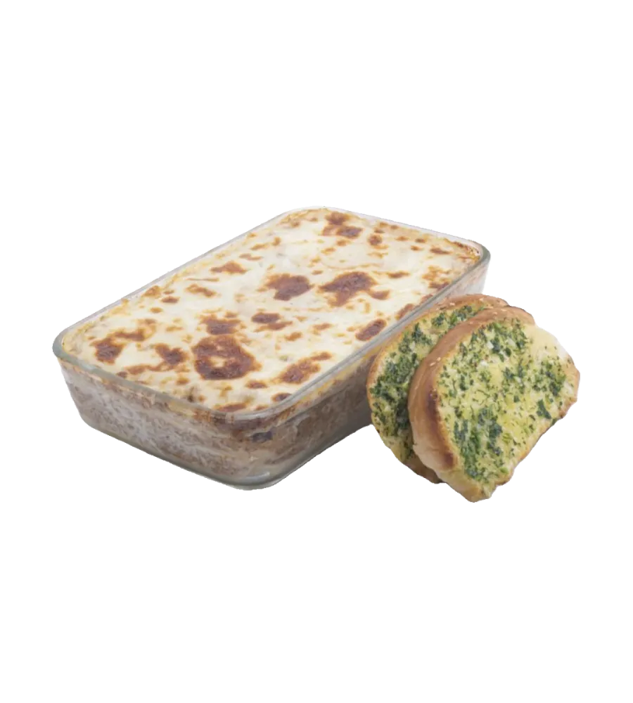 قطعتبن لحم + طبقتين معكرونة + جبنة موزريلا + قطعتين خبز بالثوم