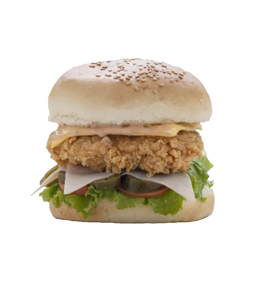 قطع دجاج زنجر 100ج + شريحة حبش مدخن + شريحة جبن + طماطم + خس + هلابينو