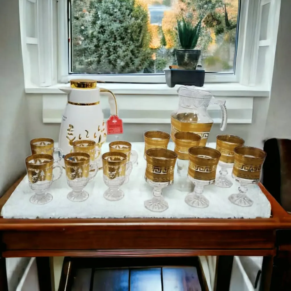 طقم اقلاص عصير 6 حبات ذهبي ملكي مع الجك كبير ملكي طقم اقلاص أبو يد 6 ملكي ثلاجة ملكي ذهبي 1 لتر