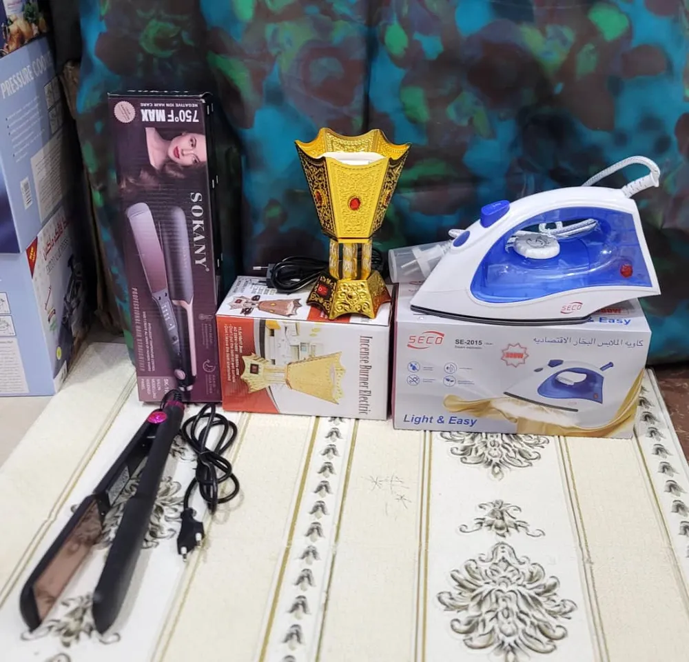 يتكون من كاويه بخار كهرباء اقتصاديه في استهلاك الكهرباء 300 وات +مجلس شعر من وكاله سكان العالميه مع ازرار التحكم في درجات الحراره +مبخره كهرباء ملكي ذهبي