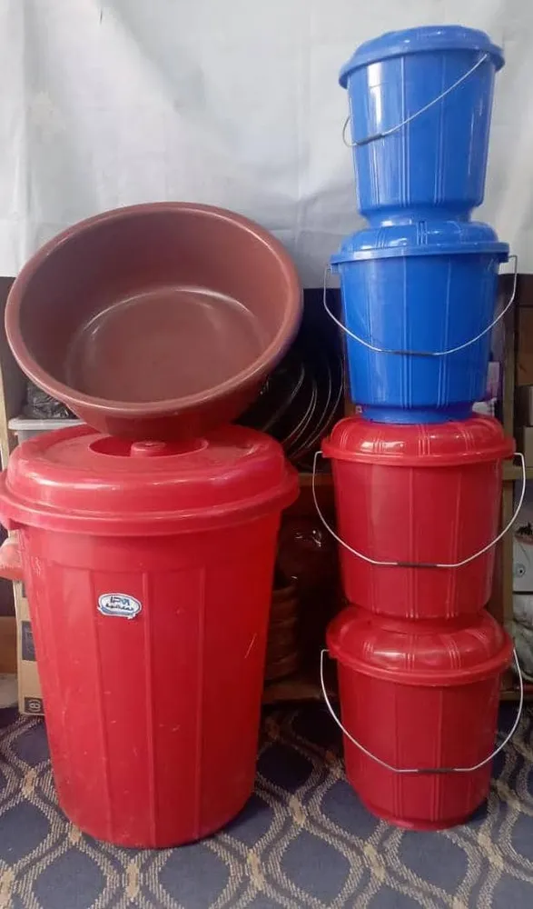 بالدي 70لتر + طاوه غسيل الحجم الواسط +2 بوالد 15لت + بالدي10لتر+ بالدي7لتر