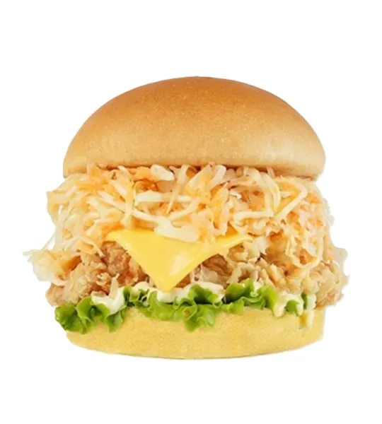 خبز برجر شريحه دجاج كرسبي شريحه جبن خس مخلل مايونيز كول سلو